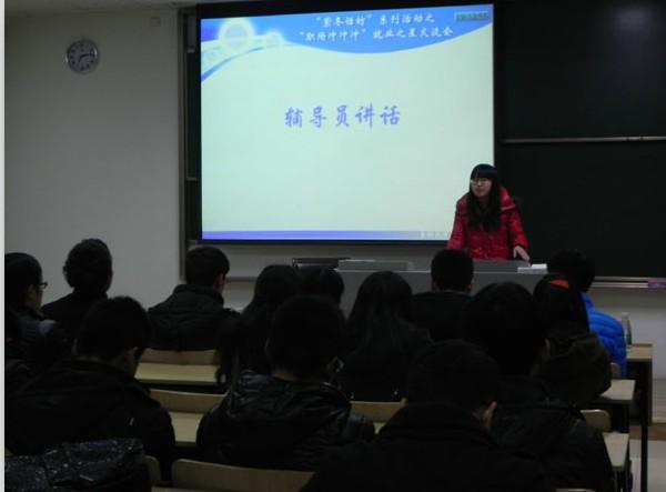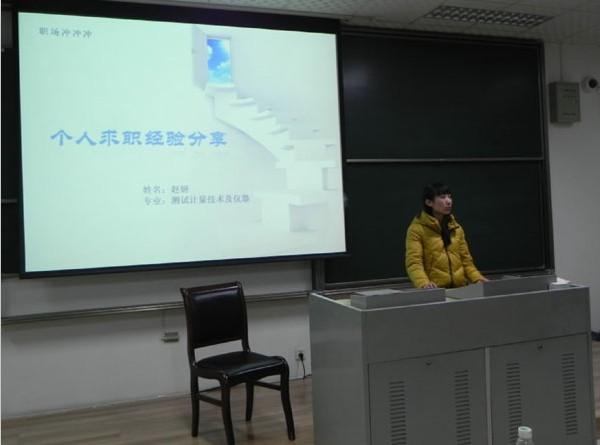 首先为现场同学作报告的是来自导航、制导与控制专业、签约中电10所的梁�同学,他分享了自己的简历制作过程,分析了自己求职过程中所考虑的因素,给同学们一个很好的参考。紧接着作报告的是来自导航、制导与控制专业、签约商飞的刘军同学,他认为除了具备科研能力外,自信也是自己求职成功的关键。随后出场的是来自控制理论与控制工程专业、签约无锡614所的陈阳同学,他认为求职成功的保障是要具备某一方面的特长,同时强调了简历制作要有重点。接下来作报告的是来自电气工程专业、签约通用电气(GE)的邢栋同学,他是六位中唯一签约外企的同学,他的成功经验告诉我们企业实习的重要性。紧接着作报告的是来自测试计量技术及仪器专业、签约华为的宋普庚同学,宋普庚同学表示自己没有其他几位同学善于言辞,但笔试及面试时的沉着、冷静以及充分的准备同样也为他赢得了好的工作机会。最后作报告的是来自测试计量技术及仪器专业、签约南京中新赛克的赵妍同学,她指出女生在求职中属于弱势群体,一定要摆正心态、理性应对就业压力。