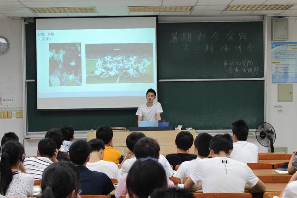 第二期培训在第一期整体介绍的基础上,对新闻稿、摄影、调研报告进行了专项培训。院团委新闻中心主任赵星星对新闻稿的写作做了一些指导,她对新闻稿的写作方法、基本要求、基本结构等方面进行了详细的讲解。暑期社会实践精彩照片奖得主张苏哲指出拍照的核心是新闻价值,并且强调了新闻照、人文照、风景照拍摄技巧的不同。2013年暑期社会实践校级明星团队“秸秆行动”的队长张根源则为大家阐述了整个调研的实施过程,从前期准备到过程再到后期加工,每一步都是一次成功调研的关键。最后院团委实践部部长王鹤彬做了总结发言,再次强调了一些注意事项。