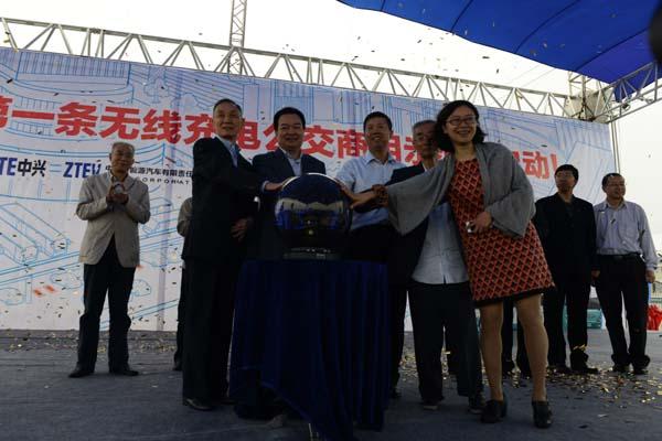 下图为无线充电大巴商用示范线启动仪式上,必赢官网陈乾宏教授(前排右1)、严仰光教授(前排右2)与中兴通讯股份有限公司董事长侯为贵(前排左1)、湖北省委常委襄樊市委书记/纪委王君正(前排左2)、东风汽车集团股份有限公司副总经理欧阳洁(前排左3)共同触摸水晶球,宣布无线充电大巴商用示范线正式启动。