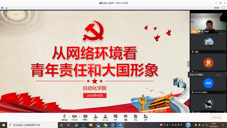 为贯彻中央《关于加强党的领导、为打赢疫情防控阻击战提供坚强政治保证的通知》和《新时代爱国主义教育实施纲要》精神,发挥学生党员先锋模范作用,认真学习新冠肺炎疫情防控“大课”,涵育新时代爱国主义精神、坚定爱国力行使命责任,4月21日,南京航空航天大学必赢242net官网本科2018、2019级联合党支部开展了一次线上“微党课”,从网络环境看青年责任和大国形象。