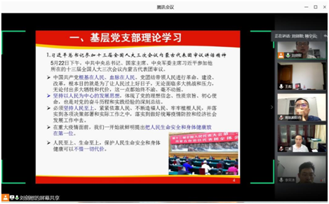 首先,刘剑慰同志按照校党委组织部发布的6月份基层支部理论学习清单,带领全体支部党员就两会精神、“习近平总书记给袁隆平、终南山、叶培建等25位科技工作者代表的回信”、以及“关于树立“过紧日子”思想、历行勤俭节约的通知“等文件进行了学习。