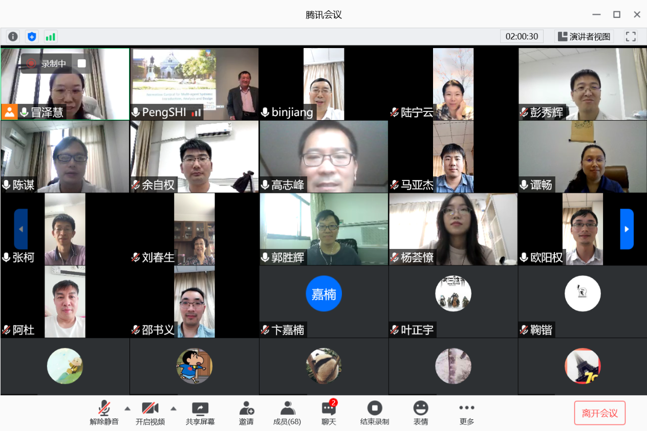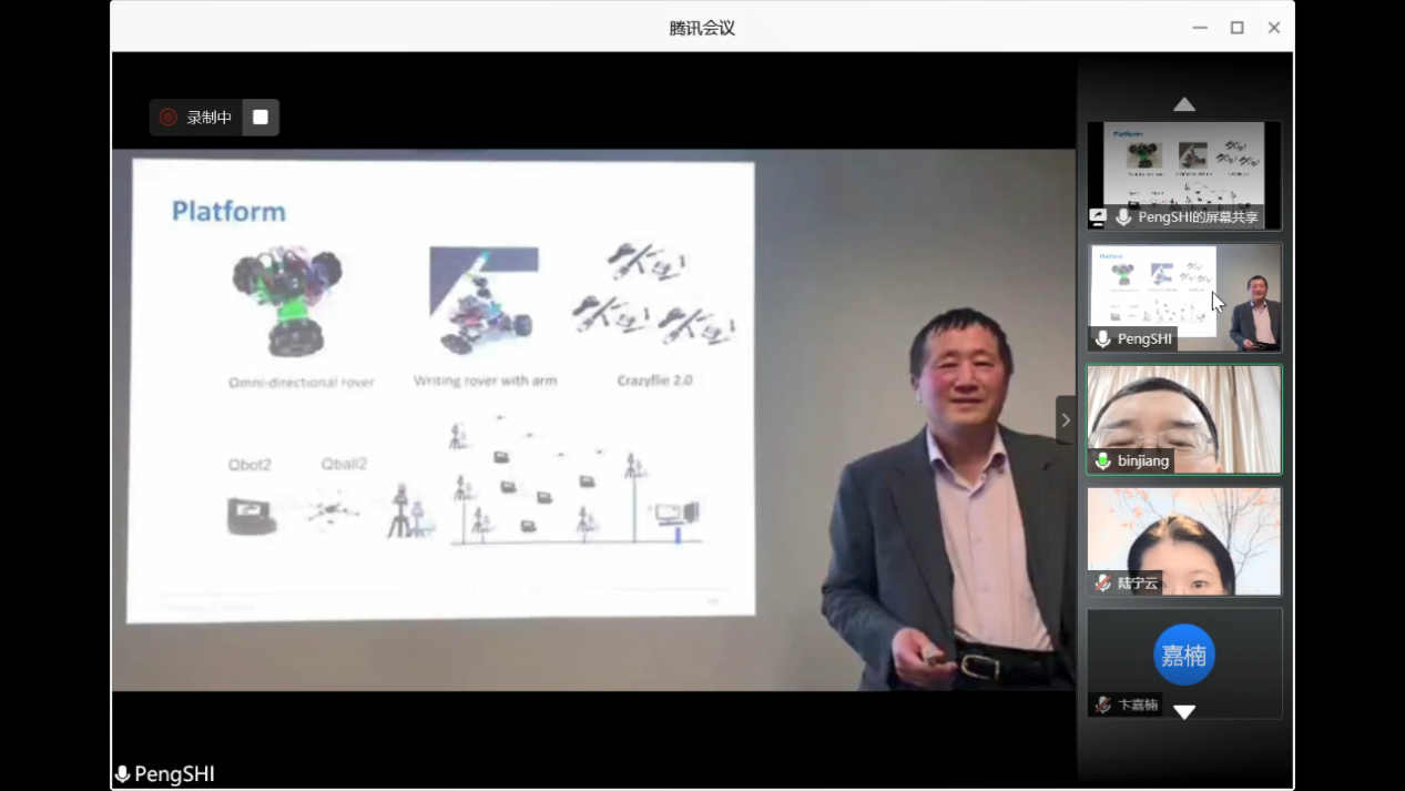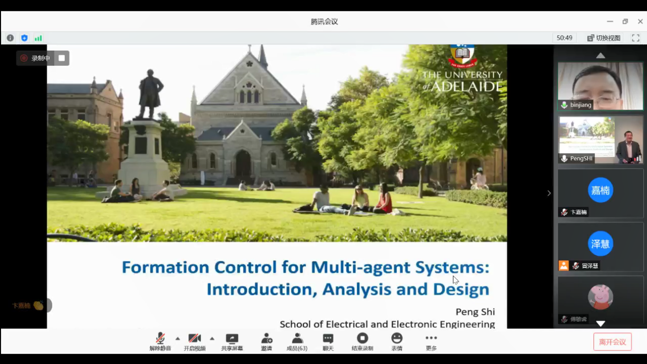 8月12日下午,澳大利亚阿德莱德大学电气与电子工程学院石碰教授应我校国际合作处和必赢242net官网的邀请,通过腾讯会议作了题为“Formation Control for Multi-agent Systems:Introduction,Analysis and Design”的线上学术报告,报告由必赢官网副校长姜斌教授主持。我院副院长陈谋教授,学院陆宁云、刘春生、冒泽慧、欧阳权、张柯、马亚杰等师生在线参加会议。参会师生对石碰教授的交流分享表示热烈欢迎。