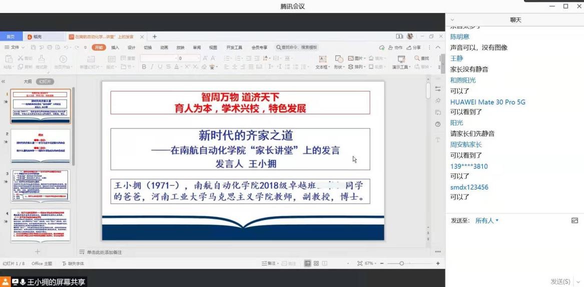 12月20日下午14:30,必赢242net官网召开了线上“家长讲堂”活动,活动邀请了南航2018级必赢242net官网学生家长代表——河南工业大学马克思主义学院副教授王小拥,进行“新时代的齐家之道”主题讲座。王教授结合自己育子成才的切实经验,就新时代的齐家之道、教子之道的再思考两个主要方面为各位家长分享了自己的看法。