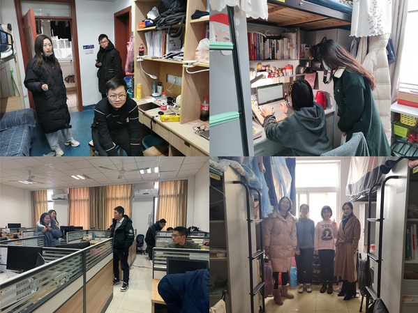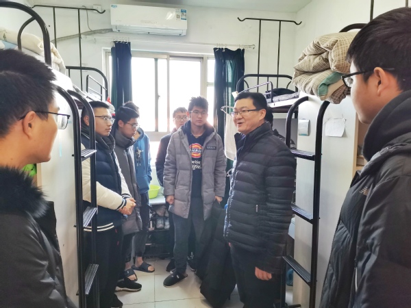 走访过程中,李文雷书记了解了学生寝室保暖措施、宿舍安全状况和学生期末复习进度,询问了学生在生活中遇到的困难,商讨解决办法。叮嘱学生注意天气变化,及时添衣,做好防寒措施,不使用明火、严禁电器等危险物品以防意外事故发生,保护好个人物品,提高防范意识和安全意识。江驹院长提醒学生临近期末要利用假期丰富和充实自我,肯定了在实验室工作的研究生刻苦钻研的精神。在场的同学们纷纷表示,在往后的学习生活中将继续努力,不断进步,不辜负领导老师们的期望。