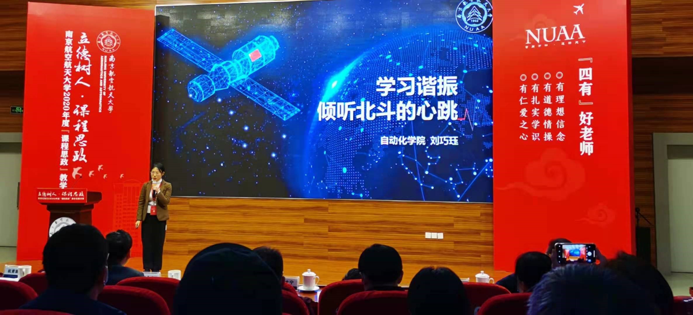 决赛现场,刘巧珏老师基于《电路》课程中的谐振知识点,以北斗卫星导航系统为切入点,讲述我国科技工作者历经多年刻苦攻关,解决卡脖子技术难题,鼓舞了学生科技报国的信念。专业课程与思政理念的有机融合,点燃了现场所有师生科技报国的满腔热情。最终取得“课程思政”竞赛一等奖的好成绩。