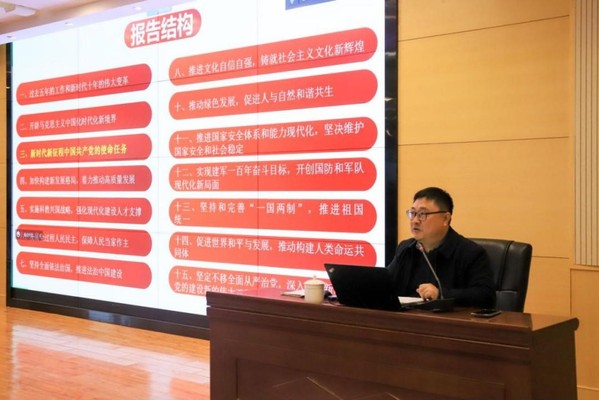 马克思主义学院平旭教授作了《以中国式现代化全面推进中华民族伟大复兴——深入学习领会党的二十大精神》专题宣讲,从什么是中国式现代化、中国式现代化的特征、本质要求和内涵、战略安排等几个方面结合党的二十大报告为同学们进行了解读,重点指出要牢牢把握新时代中国特色社会主义思想的世界观和方法论,以中国式现代化全面推进中华民族伟大复兴。