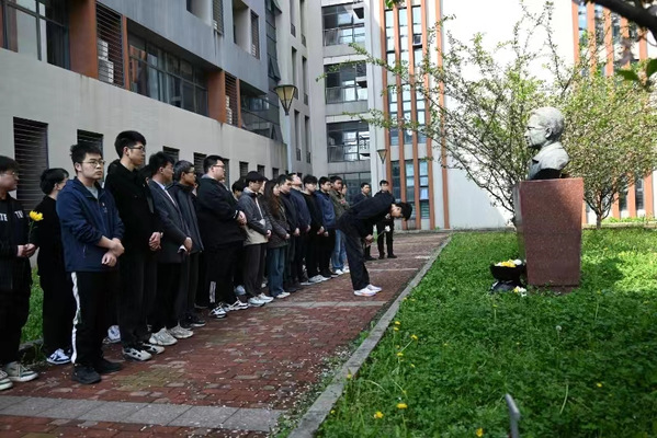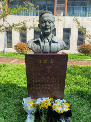 上午九点,全体师生手持黄、白两色菊花,面向丁道宏教授铜像肃立,默哀一分钟,集体鞠躬,向丁教授致以缅怀与敬意。