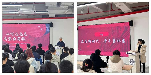 辅导员丁山、吴静文带领同学们回顾学习了“一二・九”运动的时代背景和事件经过。1935年12月9日,北平(北京)大中学生数千人举行了抗日救国示威游行,反对华北自治,反抗日本帝国主义,要求保全中国领土完整,掀起了全国抗日救国新高潮。由北平爱国学生首倡,迅速席卷全国的“一二·九”运动,极大地促进了中国人民的觉醒,标志着中国人民抗日民主运动新高潮的到来。