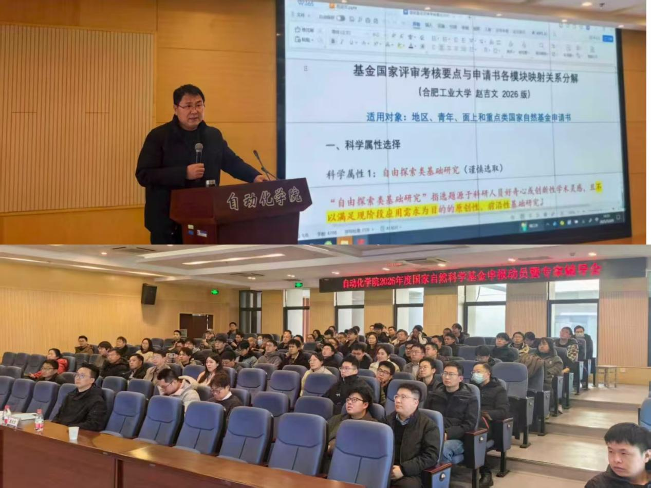 为进一步推进我院国家自然科学基金项目申报工作,精准助力青年教师提升申报书质量与竞争力,12月29日下午,学院在1号楼511报告厅组织召开2026年度国家自然科学基金申报动员暨专家辅导会。会议特邀合肥工业大学赵吉文教授作专题报告,由学院副院长魏佳丹主持,学院近60余位教师参会。
