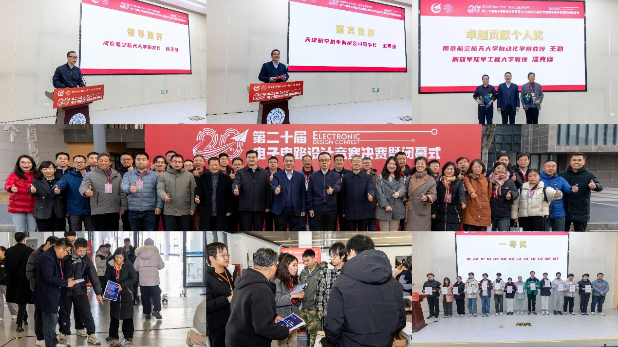 2026年1月7日,南京航空航天大学“航空工业津电杯”第二十届电子电路设计竞赛决赛暨闭幕式在天目湖校区牧星楼举行。本届竞赛适逢二十周年里程碑,意义非凡。天津航空机电有限公司董事长王民强、人力资源部部长李宏义,南京凌殴创芯电子有限公司总经理助理章喆特邀出席活动。南京航空航天大学副校长徐正扬,教务部副部长李鑫,牧星学院院长蒋彦龙,学生处副处长张建辉,校团委副书记张瀚文,天目湖校区管委会副主任潘顺荣,必赢242net官网党委书记李文雷,牧星学院党委副书记兼致慧书院执行院长丁琛,以及必赢242net官网的领导和老师出席了闭幕式。来自陆军工程大学、东南大学等高校的8名资深评审专家,以及校内16名评委老师共同见证了本届赛事盛会。